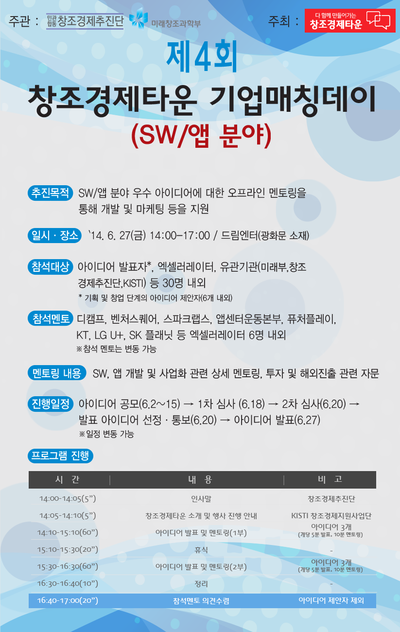 이번 행사에서는 지난 5월 30일 제3회 기업매칭데이와 마찬가지로 SW/앱 분야를 주제로 하여 창조경제타운 아이디어 공모전을 통해 접수된 사업화 아이디어를 가진 신청자를 선별하여 집중적인 오프라인 멘토링이 진행된다.