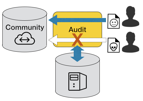 위 그림이 다시 그린 구도이다. 기존 그림과 달라진 점을 살펴보자. 기존 그림이 To-Be인데 반해 이것은 As-Is에 해당한다. 그림은 모두 왼쪽에서 오른쪽으로 읽어나갈 수 있도록 흐름을 주었고 오해를 방지하기 위해 화살표를 작게 그려넣었다. 기존 그림이 각자 다른 사용자가 다른 길로 업로드 하는 것 같은 인상을 주는데 반해 개선된 그림은 하나로 합쳐지는 흐름을 타게 되어 있다. 사용자가 업로드 하는 것은 실제로 음악화일인데 반해 기존 그림은 그것이 음악화일이라는 정보가 없었다. 개선된 그림은 이제 그걸 알 수 있다. 그리고 감사를 통해 불법자료와 그렇지 않은 자료를 구분해 내는 과정이 명확히 실려있다. 개선된 그림은 확실히 더 구체적이고 흐름이 있으며 그럼에도 불구하고 더 단순하다. 컬러를 사용하지 않았고 아이콘 몇 종류만이 사용되었으며 도형과 곡선은 모두 키노트나 파워포인트 내에서 그려넣을 수 있다.