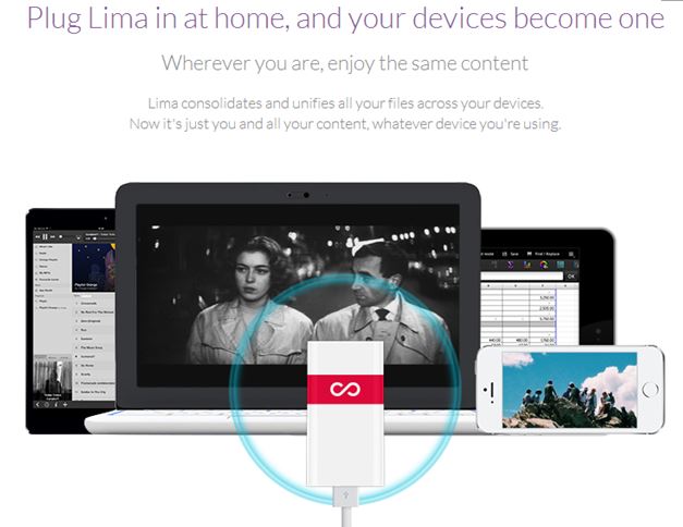 - 파일 저장 기능: Lima는 연결된 USB 하드드라이브를 클라우드 드라이브로 변환해줌. 최대 4TB까지 지원하며, 이렇게 연결된 USB 하드드라이브에 저장된 콘텐츠는 스마트폰, 데스크탑, TV에서 접근 가능함. 또한 인터넷 라우터에 연결시키게 되면 언제 어디서든 파일에 접근할 수 있음. 별도의 온라인 저장 공간을 이용하는 것이 아니기에, Dropbox같은 클라우드 서비스처럼 월 이용료를 매달 지불할 필요가 없으며, 동기화를 위한 가상의 폴더를 생성하지 않음. (*하기 이미지는 모두 lima 웹사이트 참조)
