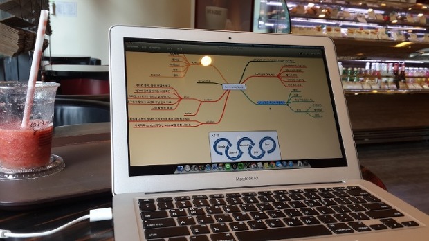 저는 맥북에어나 아이패드로 카페에서나 회의실 어디에서든 마인드맵을 열고 생각을 정리합니다. 비단 보고서 작성 목적이 아니더라도 생각을 정리(조직 구성도, 미래 성장 동력 아이템 찾기, 강연 자료 구성, 집필할 책의 목차 구성, 체크 리스트 등)할 때에 어김없이 마인드맵을 이용합니다.