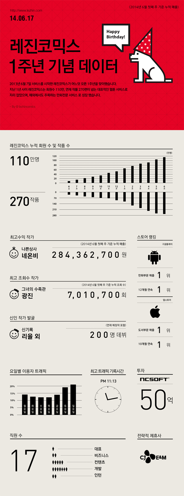 프리미엄 웹툰 서비스 레진코믹스가 서비스 1주년을 기념하여 지난 1년간의 발자취를 알기 쉬운 인포그래픽으로 정리하여 데이터를 공개했다.
