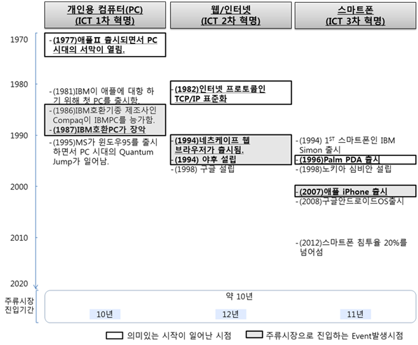 이러한 이론적 기반으로 ICT 혁신 사이클을 접근해 볼 수 있음. 이미 ICT 산업에는 3번의 혁명이 있었음. 우선 ICT 1차 산업 혁명은 PC라고 볼 수 있음. 디지털화의 기반이 되는 컴퓨팅 성능을 바탕으로 ICT 산업의 포문을 염. 1차 산업 혁명 시대인 개인용 컴퓨터(Personal Computer; PC) 시대는 1977년 애플이 애플Ⅱ를 출시하면서 당장 도래할 것처럼 보였었음. 하지만 대중시장으로 진입한 것은 IBM 호환PC가 확산된 1980년대 말임. 의미있는 제품이 나오고도 실제로 대중 시장으로 보급되는 것까지는 기반 인프라가 구축되는 등 시간이 걸림.