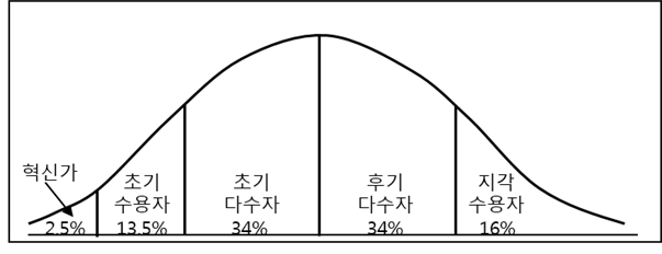 둘째 소비자들을 수용성 정도에 따라 구분한 소비자 수용곡선은 에버릿 로져(Everett Rogers)의 혁신의 확산(Diffusion of Innovation)를 활용함.