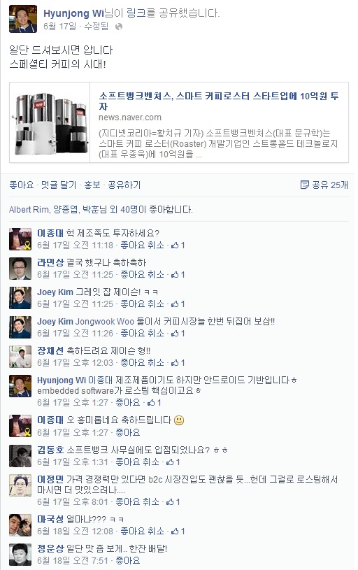 얼마전 스마트 커피 로스터 업체 ‘스트롱홀드 테크놀러지’에 투자를 마무리 하였는데. 언론 보도가 나간 이후 반응이 대략 아래와 같았다. (아래 등장하시는 분들께는 양해의 말씀 구합니다. 민감한 내용은 없는 것 같아서 허락없이 개제합니다…^^;;)