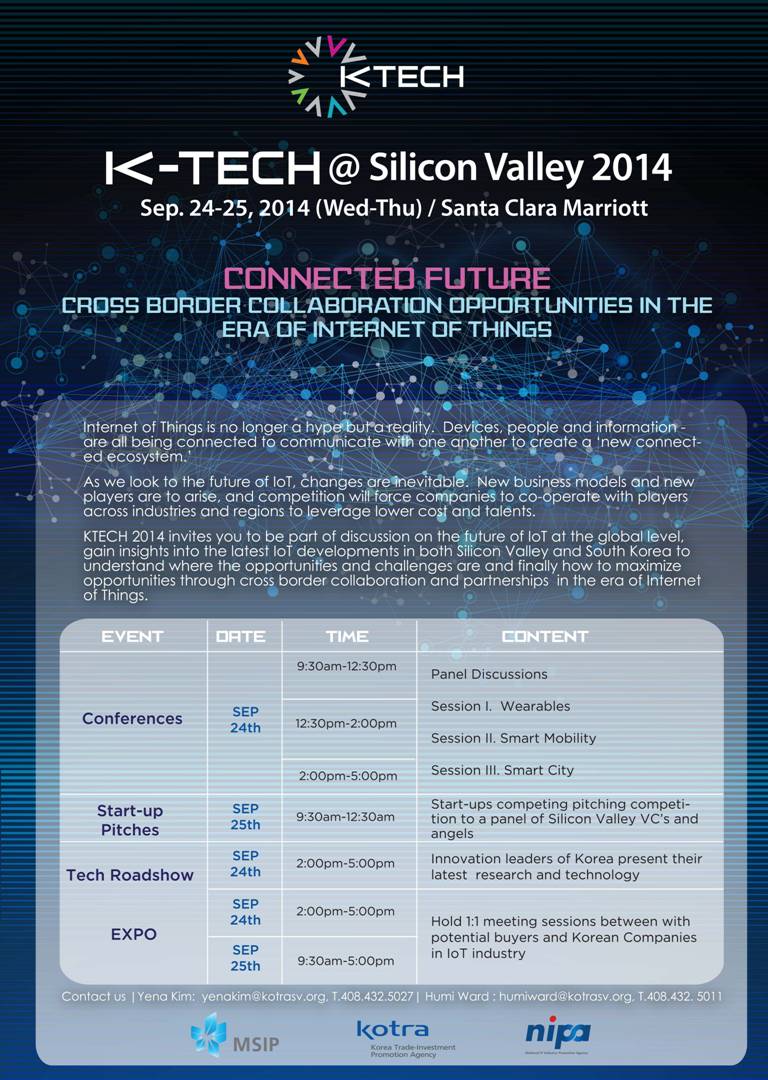 미래창조과학부와 코트라(KOTRA)는 오는 9월 24일(수)∼25일(목), 국내 유망 ICT 기업의 북미시장 진출 지원의 일환으로 아래와 같이 ‘K-Tech 실리콘밸리 2014’행사를 개최합니다. 실리콘밸리 진출을 목표로 하는 국내 스타트업의 많은 관심 부탁 드립니다.