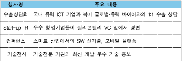 국내 ICT 기업 40곳을 선발해서 미국 현지 유력 IT 기업을 연결해 주는 프로그램을 진행하는데, 작년의 경우 구글, 파나소닉, 시스코, 스프린트, SAP, VMWare 등이 참여했습니다.