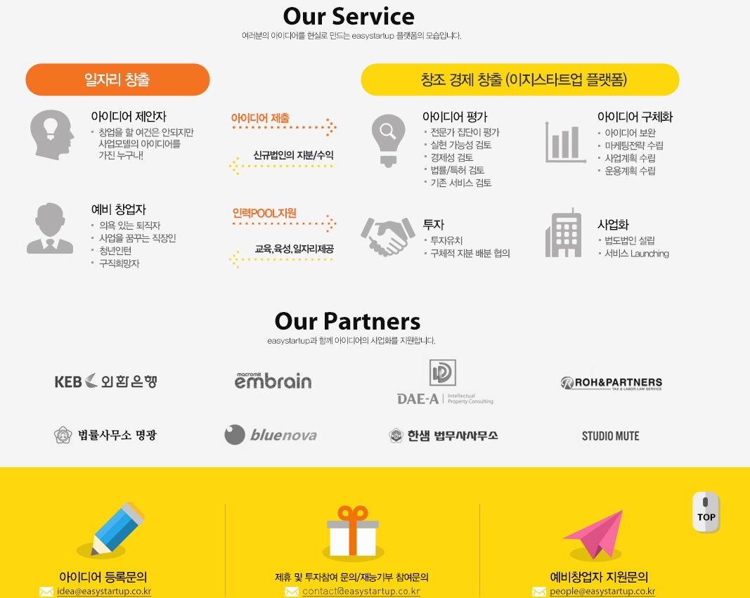 이 서비스에서는 각 분야의 최고 전문가들이 재능기부를 통해 참여하여 창업대상 아이디어를 선정하고 아이디어를 발전시켜 사업화하는데 지원하고 있으며, 신청자가 우수한 아이디어만 제공하면 별도의 창업자금을 투입하거나 현재 직장을 그만두지 않아도 대신 창업을 해 주는 서비스다.