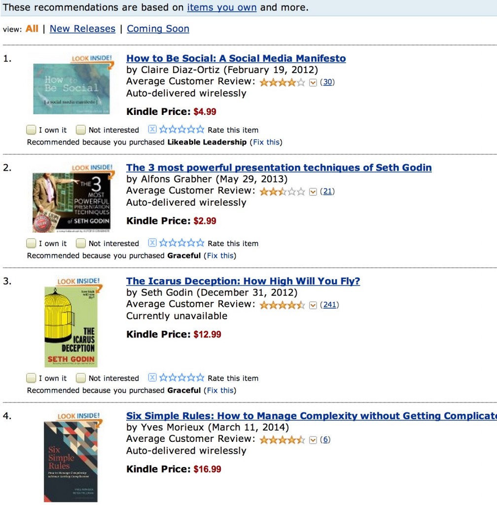 아마존 Kindle 코너 진입시. 내가 관심을 가지는 책들의 추천이 항상 제시된다. 파괴적 혁신, 매스커뮤니케이션쪽에 관심이 많은 나의 기호에 딱 맞는 책들이다.
