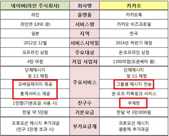 라인앳과 비즈프로필의 대략적인 비교는 아래 표와 같습니다. 단, 비즈프로필은 아직 베타서비스 단계라 정식 서비스 때는 많은 점들이 달라질 수 있습니다.