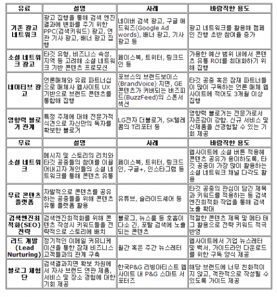 l 무료 콘텐츠 기반 콘텐츠 유통시 유의점: 공유 가능한 동영상, 발표자료, 가이드북 등을 유투브와 슬라이드세어를 통해 공유한다. 멀티미디어 콘텐츠 업로드 시, 웹사이트 URL을 담고, 제목 및 내용에 검색엔진최적화를 위한 기본적인 작업을 병행한다. 업로드된 자료들은 브랜드 연관 블로그, 소셜 네트워크 채널들을 활용하여 추가 프로모션 한다.