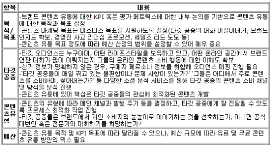 마지막으로, 브랜드 콘텐츠 유통 활동의 궁극적인 목표는 단순히 해당 메시지나 스토리의 추가 리치를 확보하는 것이 아니다. 되도록 브랜드 스토리가 지속적으로 업로드되는 온드 미디어(owned media)를 선정하고, 해당 채널을 중심으로 브랜드에 친화적인 소셜 커뮤니티를 키워나간다는 방향성을 갖고 진행가는 것이 바람직하다.