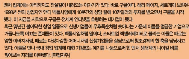 국내 창업 생태계는 사람에 비유하면 갓 걸음마를 뗀 어린애로 볼 수 있다. 옆에서 이유식을 먹이고 옷을 갈아입히는 엄마도 필요하지만 든든하게 기댈 수 있는 아빠도 빼놓을 수 없다. 엄마가 내부 관리를 맡는다면 아빠는 외풍을 막아주는 역할일 것이다.