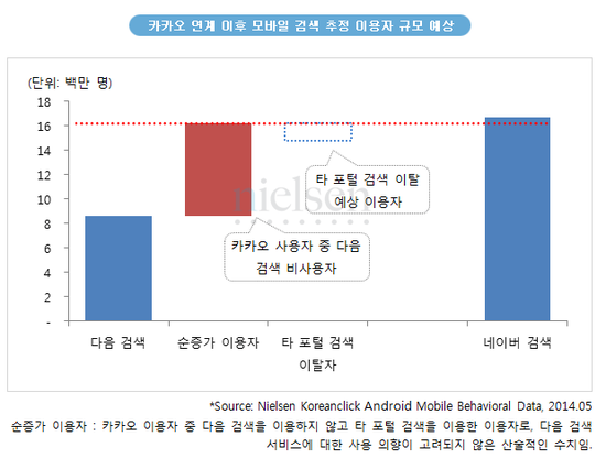 닐슨코리아클릭은 카카오의 주요 모바일서비스에 다음 검색이 연계되면 단숨에 네이버와 맞먹는 검색 모바일 검색점유율을 확보할 것으로 예상하고 있습니다.