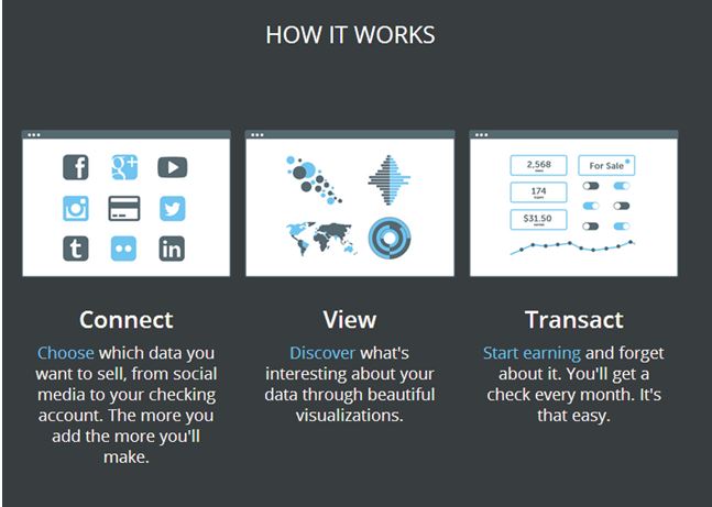 - 개인정보 데이터 판매: 개인은 가치 있는 개인정보를 광고회사에게 판매할 수 있음. 페이스북, 트위터, 인스타그램 같은 SNS 계정이나 신용카드/체크카드 정보를 DataCoup 사이트에 입력하면, 시각화된 본인의 개인정보 상태를 확인할 수 있음. 이 중 원하는 부분만은 선택하여, 판매리스트에 올릴 수 있음. 사용자는 이렇게 사이트에 개인정보를 등록하는 것만으로 매달 $8의 수익을 올릴 수 있음.이때 사이트가 수집하는 개인정보의 예는 다음과 같음. (*하기 이미지는 datacoup 웹사이트 참조함)