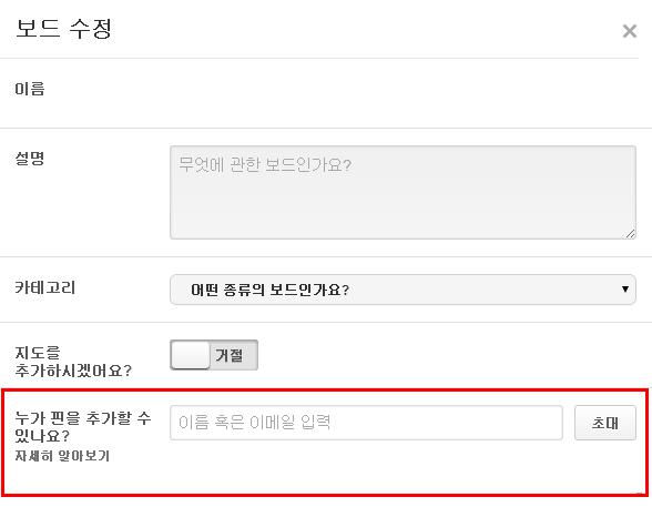 나의 보드에 올라와 있는 사진들을 지인들과 공유하고 싶다면, 다른 사람을 초대할 수 있다. 공유하고 싶은 보드에서 ‘보드 수정’을 클릭, ‘누가 핀을 추가할 수 있나요?’ 란에 지인들을 초대해 보자. 큐레이션한 사진을 다른 사람들과 함께 공유할 수 있다.