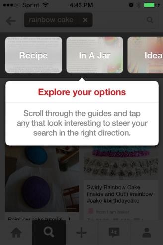 핀터레스트는 가이드 검색 기능을 영문 서비스로 제공하고 있다. 가이드 검색 기능이란 사용자가 찾고자 하는 내용이 명확하지 않을 때에도 용이한 검색이 가능하도록 고안된 서비스다. 사용자는 큰 범위에서 하나의 단어를 입력하는 것부터 시작해, 가이드 검색이 검색 창 하단에 제시하는 다양한 제안을 따라가 원하는 핀(Pin)을 찾을 수 있게 된다.