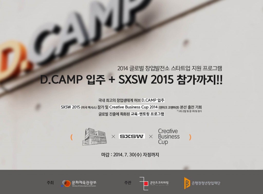 게임, 음악, 영상, 애니메이션, 출판, 패션, 건축 등 콘텐츠 및 창조산업 스타트업들 가운데 역량이 뛰어난 5개 팀을 선발하여, D.CAMP 입주기회와 더불어 글로벌 창조산업 페스티벌인 SXSW 2015 참가는 물론, 참가 팀 중 1 팀에게는 덴마크 코펜하겐에서 개최되는 Creative Business Cup 2014 본선 진출까지 지원할 계획이다.