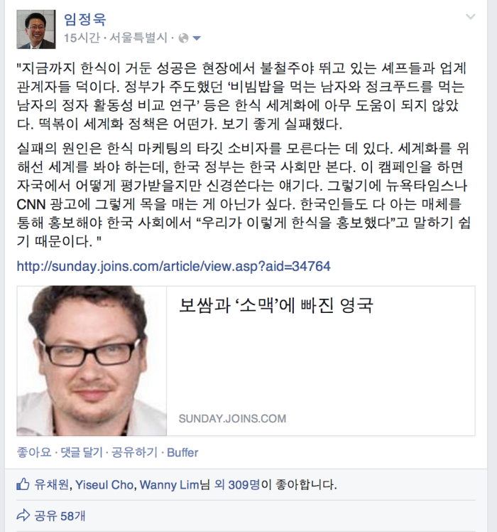 오늘 아침에 페이스북에 중앙선데이 칼럼 하나를 소개했다가 흥미로운 경험을 했다. 나름 글에 공감을 해서 인상적인 부분을 인용해서 가볍게 페이스북 담벼락에 썼다. 가볍게 공유했을뿐인데 내 예상과는 달리 반응이 뜨거운 편이었다. 15시간이 지난 지금 Like도 꽤 많이 나왔고 공유도 많이 되었다.