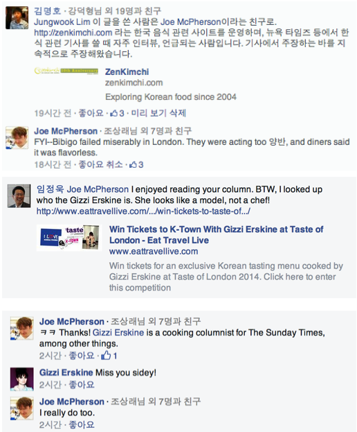 내가 아침에 읽은 신문칼럼의 저자와 그 칼럼에 사례로 나오는 영국의 요리사가 순식간 페이스북을 통해서 내 담벼락에 등장해서 이야기하게 된 것이다. 얼마나 놀라운 세상인가.