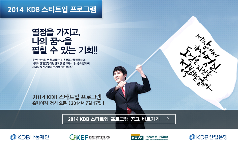 KDB나눔재단은 한국청년기업가정신재단 주관으로 KDB산업은행, 벤처기업협회와 함께 예비창업자의 성공창업을 지원하는 ‘2014 KDB 스타트업 프로그램’을 진행한다.