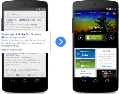 그리고 지난 6월 25일, Google I/O에서 모든 Android 개발자/사가 App Indexing에 참여할 수 있게 되었다고 발표하였다. 구글이 웹 상의 검색 결과는 물론, 동일 디바이스에서 작동하는 앱 내에 있는 콘텐츠까지 결과값으로 보여줄 수 있게 된 것이다. 예를 들어, 구글 모바일 검색 앱에서 최근 뉴스와 관련된 문장을 검색하면 Huffington Post 앱 내에 있는 기사에 대한 Direct Link까지 보여주는 식이다. 또한 가수 이름을 검색하면, 동일 디바이스 내에 있는 뮤직 앱 아이콘을 보여주고, 단 한번의 탭으로 해당 가수의 음악을 들을 수 있다. 더 나아가 이 기술은 검색어 직접 입력(typed) 또는 음성 명령(spoken commands)에도 작동하도록 확장할 것이라고 한다.