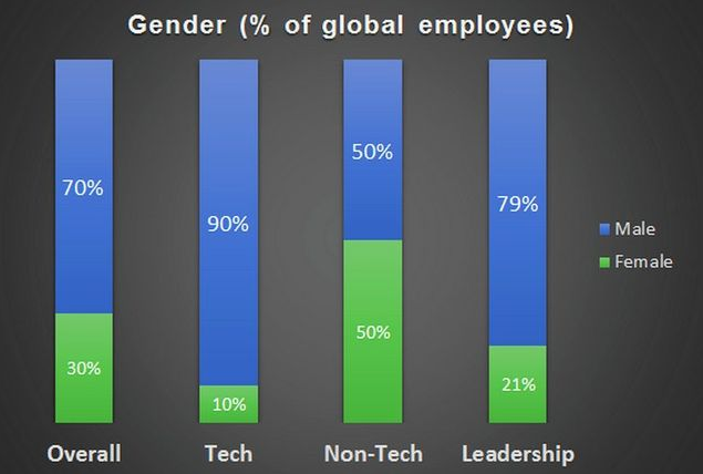 개인적으로 최근 많은 관심을 가지고 있는 성비 구성관련한 자료를 조금 더 살펴보니 기술계열과 비기술계열에서의 차이가 확연하게 드러났습니다. 비기술계열에서는 남성과 여성의 비율이 50:50 으로 균형을 이루고 있지만 기술계열에서는 남성이 90%를 차지하고 여성은 고작 10% 수준으로 무척 낮은 수의 임직원만이 근무하고 있는 것으로 밝혀졌습니다. 기업에서 직원을 채용하는 조건이 인종이나 성별에 앞서 해당 직무에 대한 전문성을 가진 사람이 되어야 하는 것은 불변의 진리입니다. 그렇지만 실제 불균형이 발생하고 있을때는 “왜?” 라는 질문을 던지고 있느냐 그렇지 않느냐도 중요한 포인트입니다.