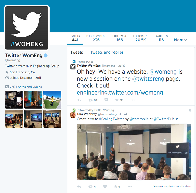 트위터는 여성들이 보다 적극적으로 회사의 업무에 관여하고 더 많은 기회를 가질 수 있도록 다양한 그룹, 프로그램을 만들어 운영하고 있습니다. 여성 엔지니어링 그룹의 공식 트위터에 업데이트 되는 내용들이 아주 많지는 않지만 트위터 내에서 여성 엔지니어들의 활약상을 확인해 볼 수 있고 (자세히 살펴보기[바로가기]) 트위터의 UX 관련 여성 종사자들의 공식 트위터 계정도 최근 개설되어 보다 적극적으로 여성들의 활동을 장려하려는 움직임이 눈에 띕니다 (자세히 살펴보기[바로가기])
