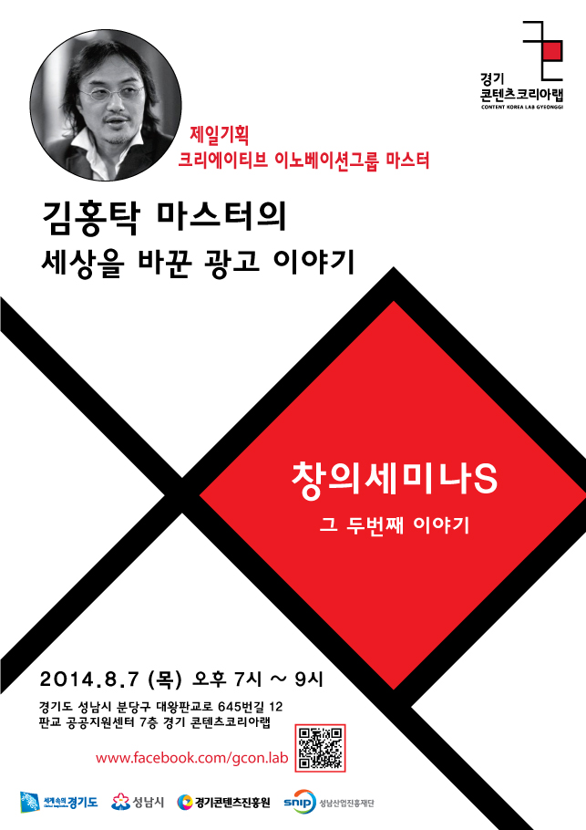 경기콘텐츠진흥원에서는 콘텐츠 관련 인사들을 초청해 문화콘텐츠에 관심있는 사람들에게 유익한 시간을 제공하는 창의세미나S를 운영하고 있습니다.  지난 달에 첫번째 시간으로 ‘광해, 왕이 된 남자’ 원동연 제작자를 초청해서 유익한 시간을 보냈는데, 이번에는 제일기획 김홍탁 마스터를 모시고 ‘세상을 바꾼 광고 이야기’를 들어보고자 합니다.
