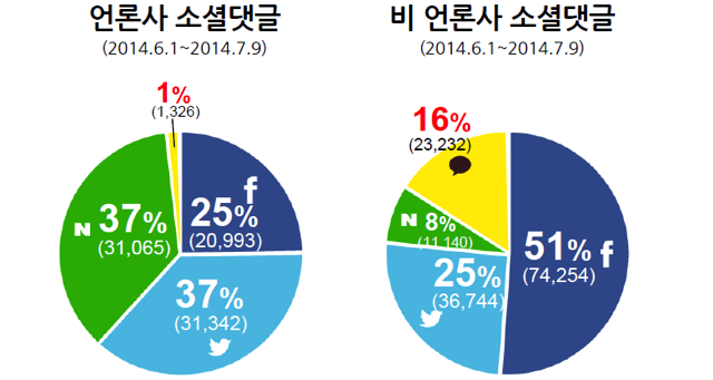 언론사 댓글에서 카카오가 차지하는 비중은 1%에 그치는데 비해, 언론사가 아닌 다른 사이트에서 카카오가 차지하는 비중은 무려 16%로 네이버를 제치고 상당한 성과를 보여주고 있습니다. 언론사에서는 네이버와 트위터 비중이 페이스북을 압도하고 있고, 비 언론사에서는 페이스북이 절대적인 위치를 차지고하고 있다는 점도 눈에 띄네요.