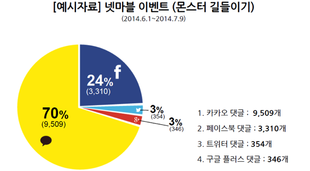 댓글 수가 아닌 댓글을 단 계정을 살펴보면 카카오(16,824명), 페이스북(34,186명), 네이버(14,131명), 트위터(12,512명) 등으로 페이스북에 이어 두번째를 차지하고 있네요. 트위터 이용자가 댓글을 다는 횟수가 가장 많다는 점도 알 수 있네요.