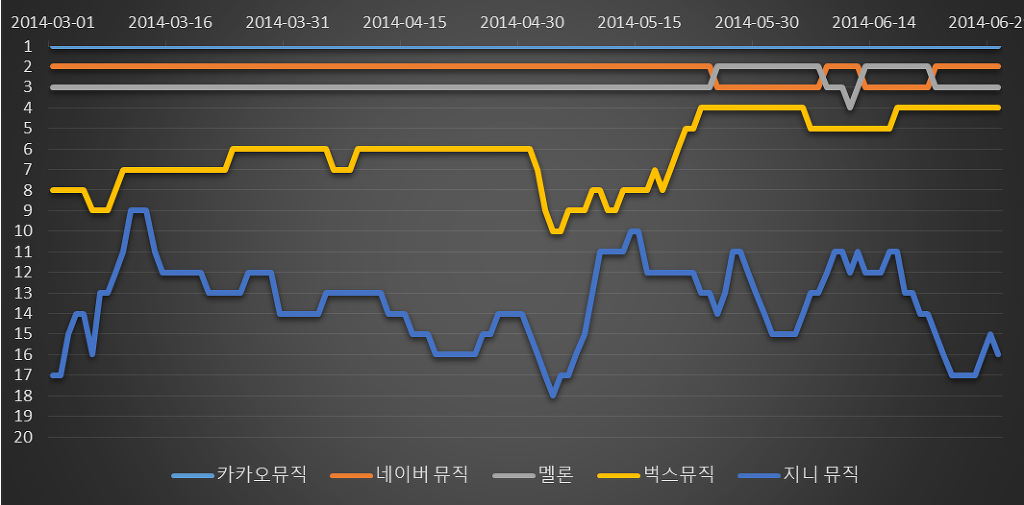 뮤직 앱 랭킹 변화 (카테고리: 무료 – 음악 및 오디오, 최고 매출, ’14.3.1 ~ 6.30 기준)