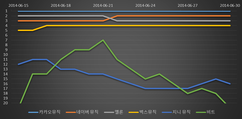 뮤직 앱 랭킹 변화 (카테고리: 무료 – 음악 및 오디오, 최고 매출, ’14.6.15 ~ 6.30 기준)