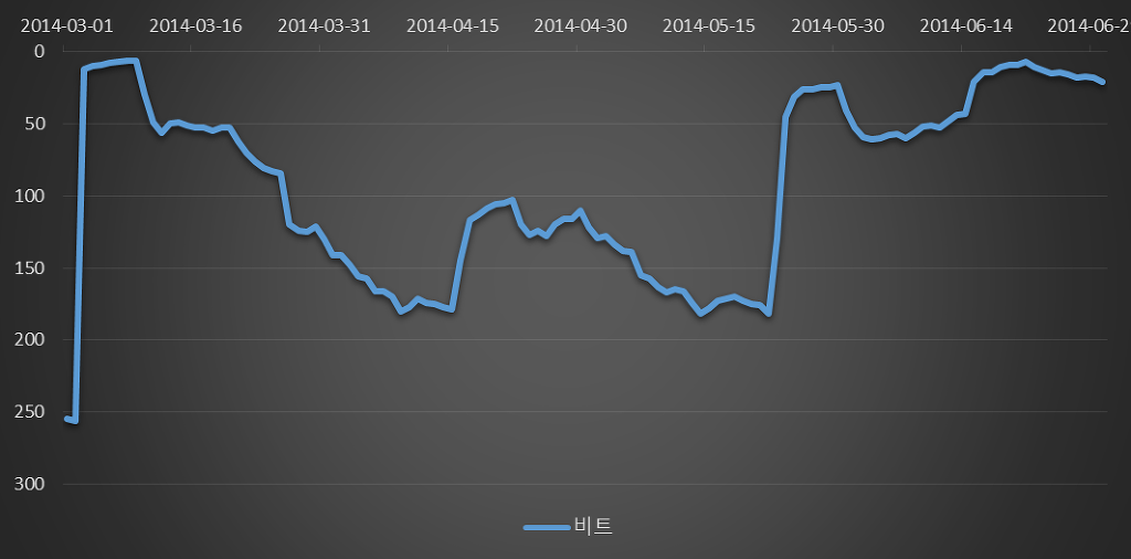 비트 앱 랭킹 변화 (카테고리: 무료 – 음악 및 오디오, 최고 매출, ’14.3.1 ~ 6.30 기준)