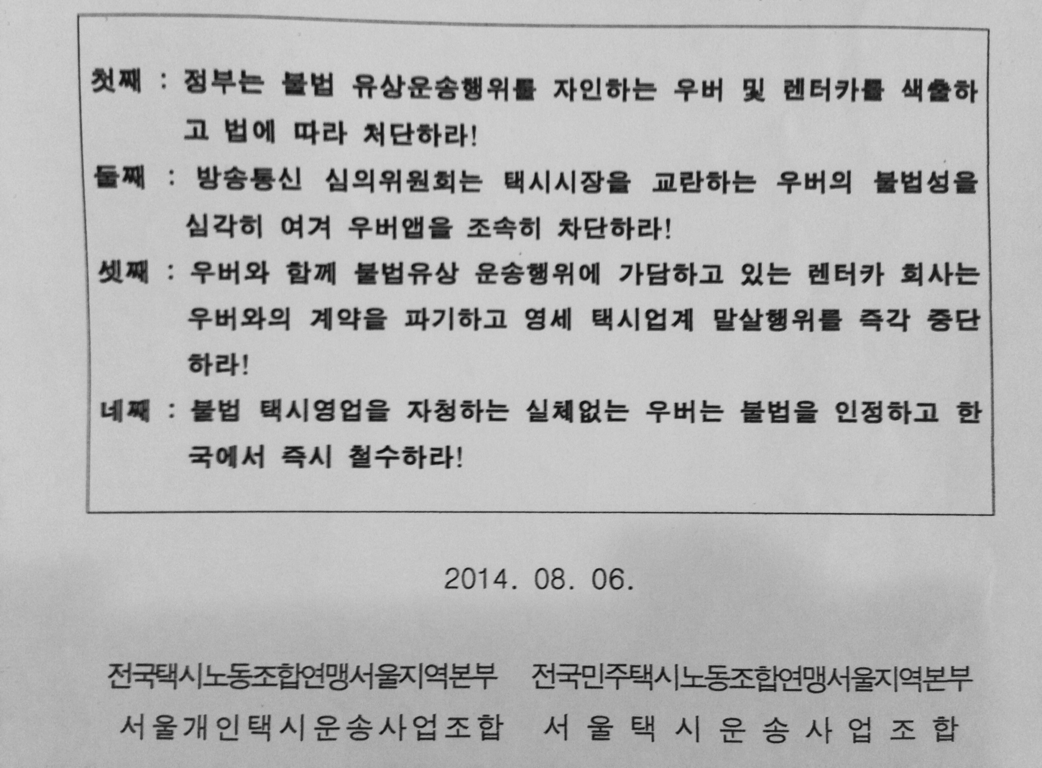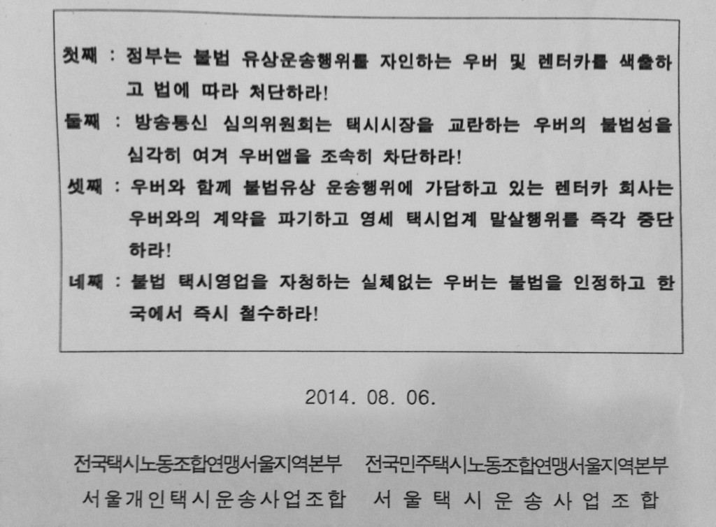 또한 간담회 장소에서는 전국택시노동조합연맹서울지역본부 등 택시업계에서 ‘우버 퇴출을 위한 기자회견문’을 배포하기도 했다. 이들은 우버 서비스가 불법 행위를 조장하고, 이용자들에게 큰 피해를 입힐 수 있다며 우버 서비스를 중단해 줄 것을 요청했다.