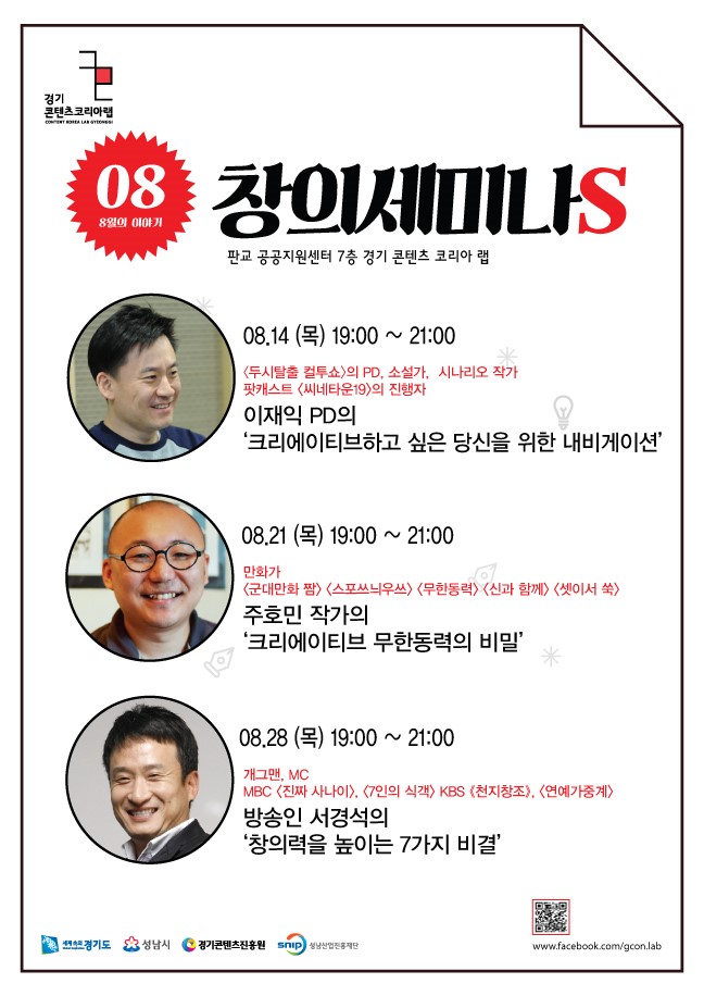 한편, 창의세미나S는 매주 목요일, 콘텐츠관련 전문가들을 초청해 스타트업과 문화와 관련된 커리어를 꿈꾸는 사람들에게 지식나눔 시간을 제공한다. 8월의 초청 연사로는 14일 이재익 SBS PD, 21일 주호민 웹툰작가, 28일 서경석 MC가 섭외되어 청중들과 만날 시간을 기다리고 있다.