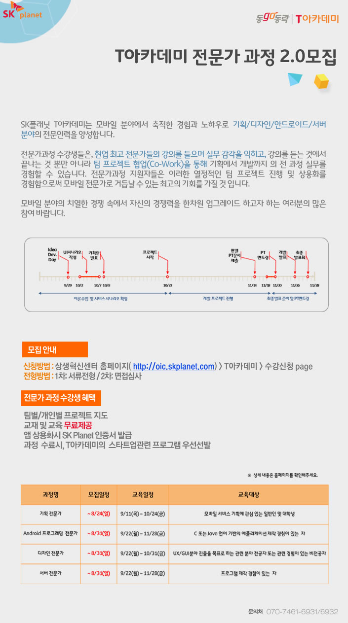 이번 2014 가을학기를 맞이하여 진행될 모바일 전문가 과정에서도 각 분야의 현업 최고 전문가들의 강의를 들으며 실무 감각을 익히고, 강의를 듣는 것에서 끝나는 것이 아니라 팀 프로젝트를 통한 상용화를 진행할 수 있도록 마련되었다. 서류와 면접 전형을 통해 수강생을 선발할 예정이며, 수강신청은 기획과정은 이달 24일까지, 디자인/안드로이드/서버 과정은 이달 31일까지 모집할 예징이다. SK플래닛 상생혁신센터 홈페이지를 통해 신청할 수 있다.