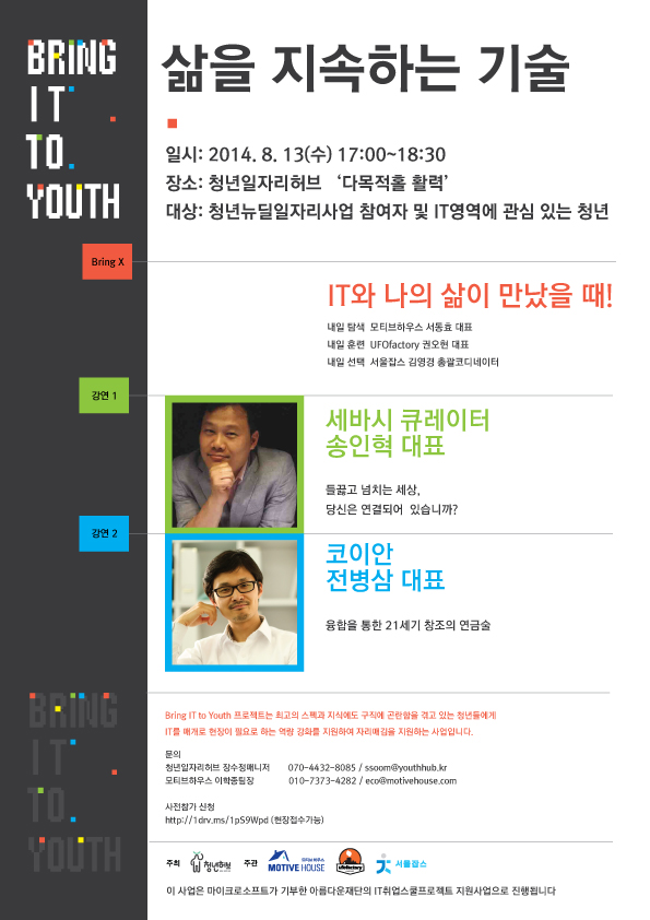 마이크로소프트, 아름다운재단 그리고 서울시 청년일자리허브가 오는 13일 IT교육의 의미를 알리기 위한 대중강연을 개최한다. 이번 행사의 제목은 ‘Bring IT to Youth, 삶을 지속하는 기술’이며, 사람을 이어주고 삶을 지속가능하게 할 수 있는 기술에 대한 이야기를 담았다. 장소는 청년허브 다목적홀이며 참가비는 무료이다.