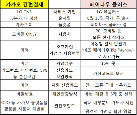 LG유플러스는 자체 간편결제 플랫폼 ‘페이나우 플러스’를 선보였으며, LG CNS는카카오와 함께 ‘카카오 간편결제’ 서비스를 준비 중입니다.