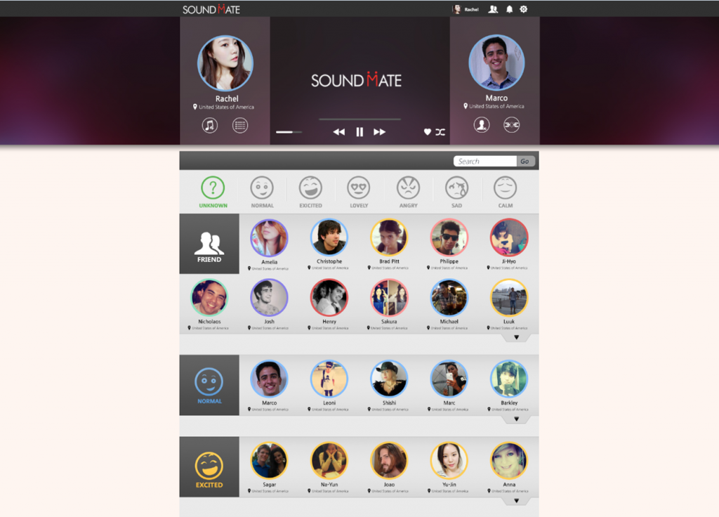 뿐만 아니라 자신의 기분에 따라 다양한 사람들과 음악을 공유할 수 있도록 만들었다. 사용자는 자신의 기분을 선택하고, 자신의 기분과 동질감을 느낄 수 있는 다른 사용자를 찾을 수 있으며, 이렇게 같은 기분의 사람을 매칭시켜 음악을 같이 들을 수 있는 서비스가 사운드메이트다.