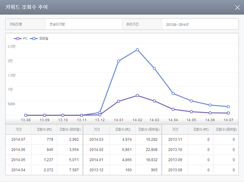 아래처럼 네이버 검색광고에서 키워드를 검색하면 인기도의 변화를 짐작할 수 있습니다.