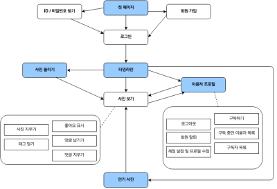 그럼 각 페이지 별 기획을 하겠습니다. 먼저 내가 구독(following)하고 있는 이용자들이 올린 사진을 보는 페이지부터 볼까요. 페이스북이나 트위터를 이용하신다면 타임라인(timeline)이라는 페이지나 기능에 익숙하실 겁니다. 자신의 글이나 사진을 포함해서 친구, 혹은 나와 관련된 컨텐츠를 시간 역순으로 나열하는 컨텐츠 연대표이죠.
