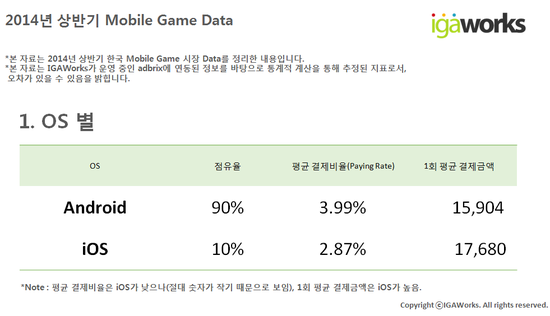 모바일마케팅 전문기업 아이지에이웍스(IGAW)가 상용화된 모바일게임의 운영체제(OS) 이용 비율을 살펴보니, 안드로이드로 게임을 즐기는 비율은 90%, iOS는 10%로 조사됐습니다.