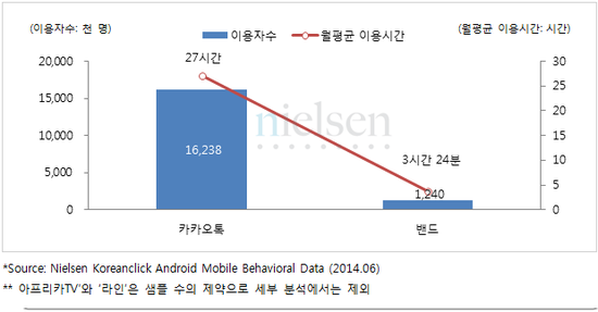 카카오톡을 제외하고는 밴드(124만명), 아프리카TV(18만명), 라인(16만명) 순으로 크게 뒤지는 모습이었습니다.