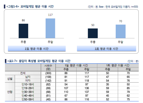 또 여성 모바일게임 이용시간이 주중과 주말 각각 91분과 118분으로 조사돼, 남성(주중 81분, 주말 117분) 보다 더 많이 사용하고 있는 것으로 조사됐습니다.