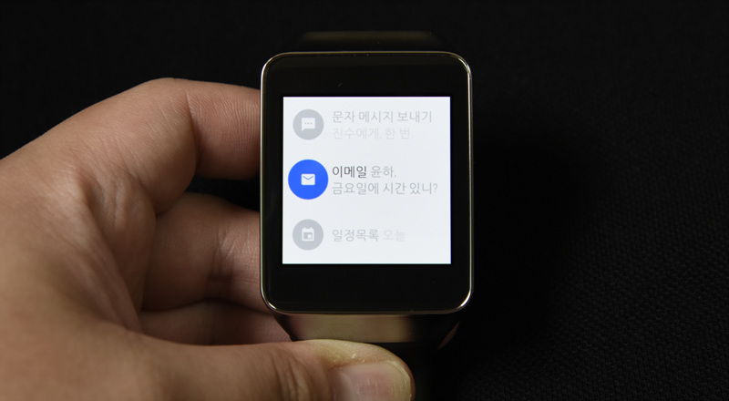 ‘스마트폰 기능의 일부’란 뭘까. 안드로이드 웨어는 스마트폰에 도착한 문자 메시지, 이메일, 일정 등을 간략하게 확인할 수 있다. 확인할 수 있는 게 전부는 아니다. 답장도 보낼 수 있다. 글자 입력은 음성으로 한다. 사용자가 말하면 이를 알아듣고 그대로 받아 적는다. 인식률은 매우 뛰어나다. 빠르게 말해도 대부분 제대로 받아 적는다. 또박또박 말하면 틀리는 경우가 없다. 다만 사투리는 전혀 알아듣지 못한다.