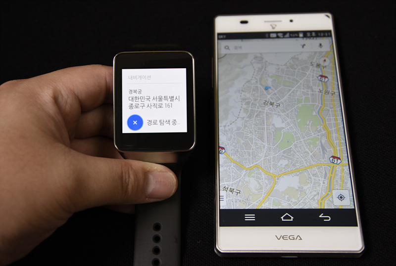 주변 탐색 기능도 유용하다. 이를 활용하면 주변 지형뿐만 아니라 특정 장소까지 어떻게 가야 하는지 확인할 수 있다. 자세한 지도는 안드로이드 웨어가 아니라 스마트폰으로 봐야 한다.