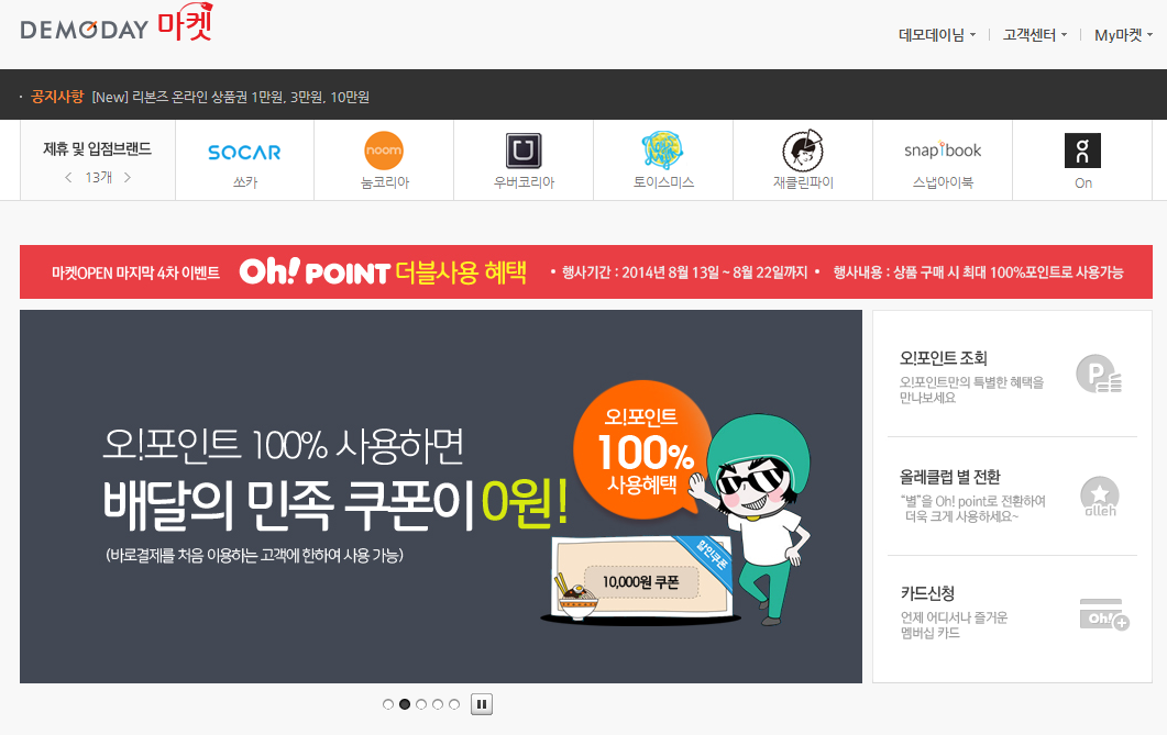 지난달 23일 정식 오픈한 데모데이 마켓에는 현재 배달의 민족, 요기요, 리본즈코리아, 스니커즈뉴욕, 쏘카, 눔코리아, 토이스미스 등 배달앱, 온라인쇼핑몰, 공유경제 등 다양한 사업을 추진하는 13개의 혁신형 중소기업이 입점해 있으며 특별한 마케팅없이 입소문만으로 판매가 확대되고 있어 중소기업 판로개척의 의미 있는 채널로 자리잡을 수 있을지 귀추가 주목된다.