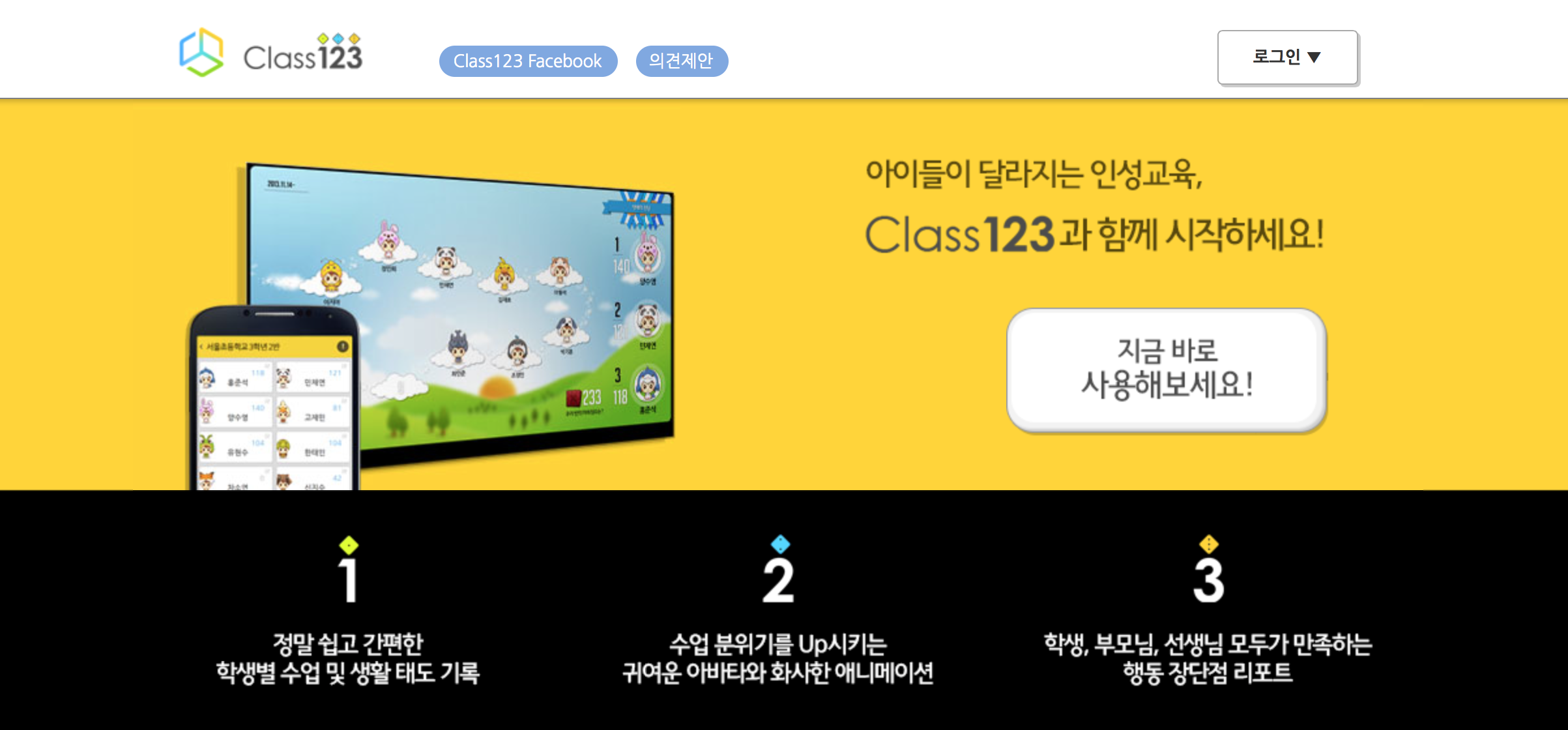 ‘클래스123’은 선생님을 위한 학생 행동 관리 도구이다. 5~15세 아이들의 교실 내 행동을 긍정적으로 개선해 나아가기 위한 서비스이다. 기존의 학교에서는 아이들의 행동을 관리하기 위해 규칙을 정해 놓고 그것을 지키지 않았을 때 꾸중 혹은 벌점을 통해서 통제하려는 성격이 강했다. ‘클래스123’은 멀티미디어를 활용하여 좀 더 재미있게 학생 행동관리 문제를 풀어나갔다. 수업 중에 색다른 칭찬을 받은 아이를 보면서 다른 아이들에게도 모범적인 사례로 자연스럽게 교육이 된다. 꾸중을 받게 되더라도 엄격하고 무서운 분위기에서 이루어지지 않고, 밝은 분위기 속에서 긍정적 행동이 유도될 수 있도록 돕는다.