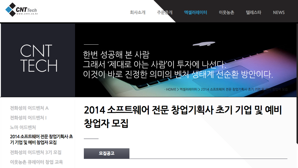 외식주문중개 전문기업인 씨엔티테크가 ‘SW창업기획사 스타트업’ 참가자를 모집한다. 씨엔티테크는 ‘전화성의 어드벤처’를 통해 학내벤처를 대상으로 한 엑셀러레이팅 프로그램을 진행 중이며, 무료 BI센터제공 및 투자 등으로 10여개의 스타트업을 지원하고 있다.