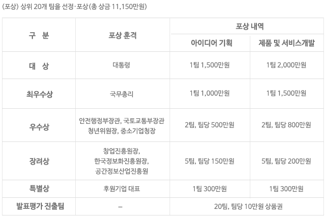 우선 수상자에게 대통령상(2팀), 국무총리상(2팀) 등 국가포상을 수여하고 총 1억1150 만원(대상 2000만원) 규모의 사업자금을 지원한다.